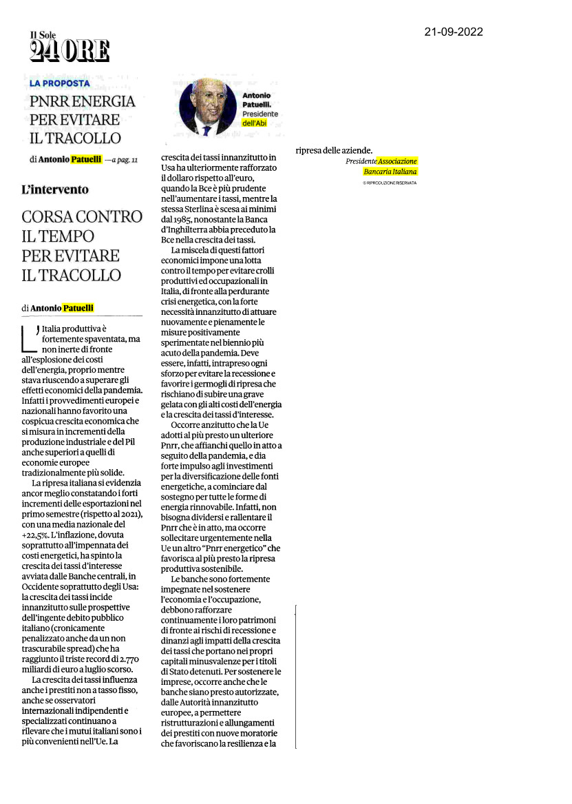 Articolo del Presidente Patuelli sul Sole 24 ore